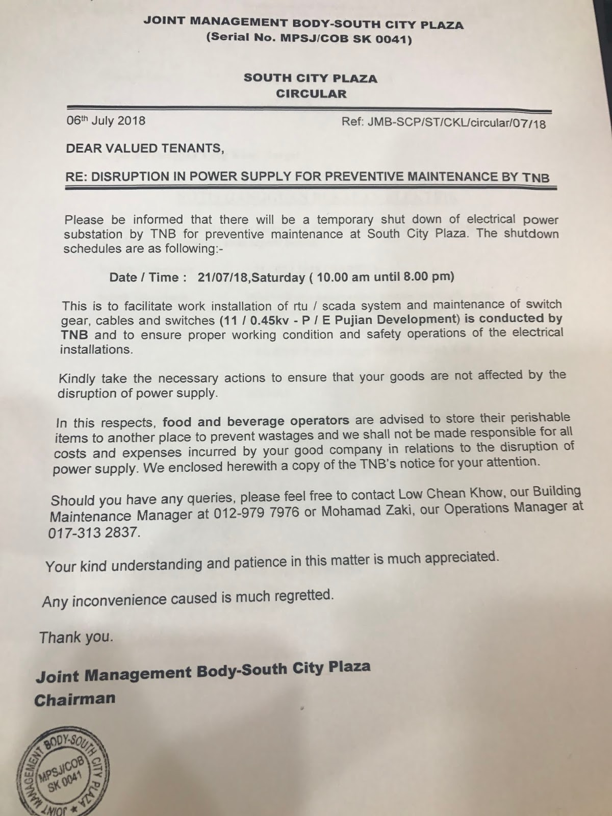 Because our shop which inside of South City Plaza, they and TNB need to stop the power for one day to do maintenance.